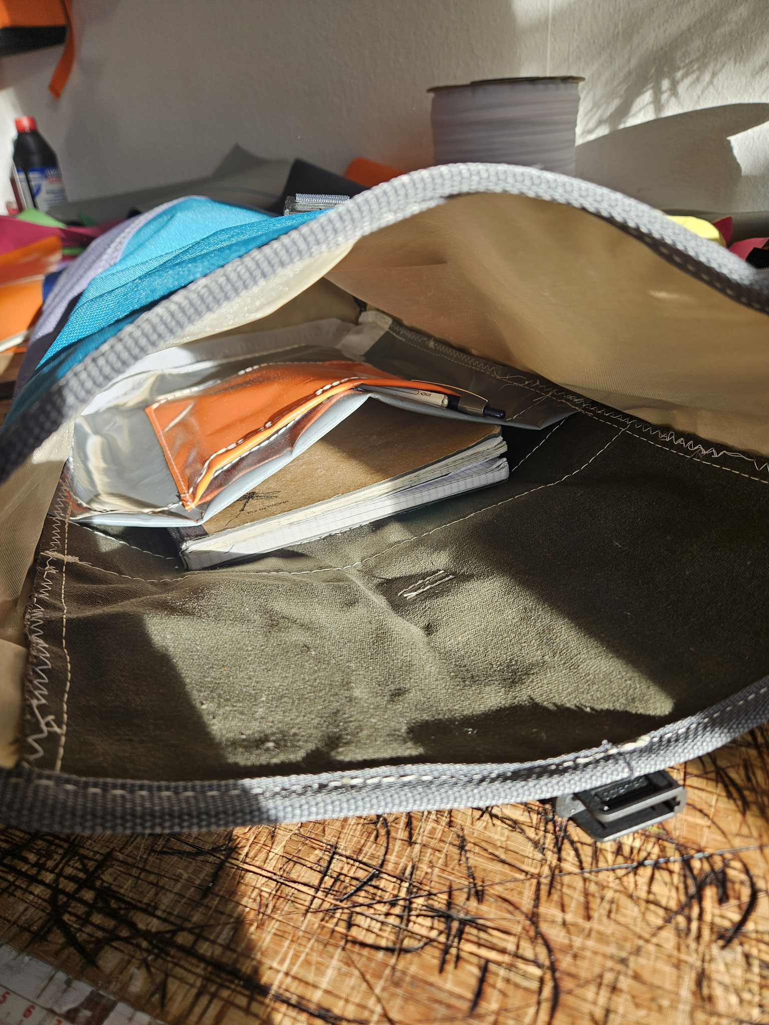 Es gibt innen und außen Schlaufen für Karabiner/Schlüssel.